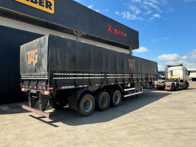 Semirreboque Schiffer LS 3 Eixos, ano/modelo 2021/2022, com 3 eixos, 13 rodas em aço, suspensor pneumático no 1º e 3º eixos, equipado com lanternas em LED, na cor preta.